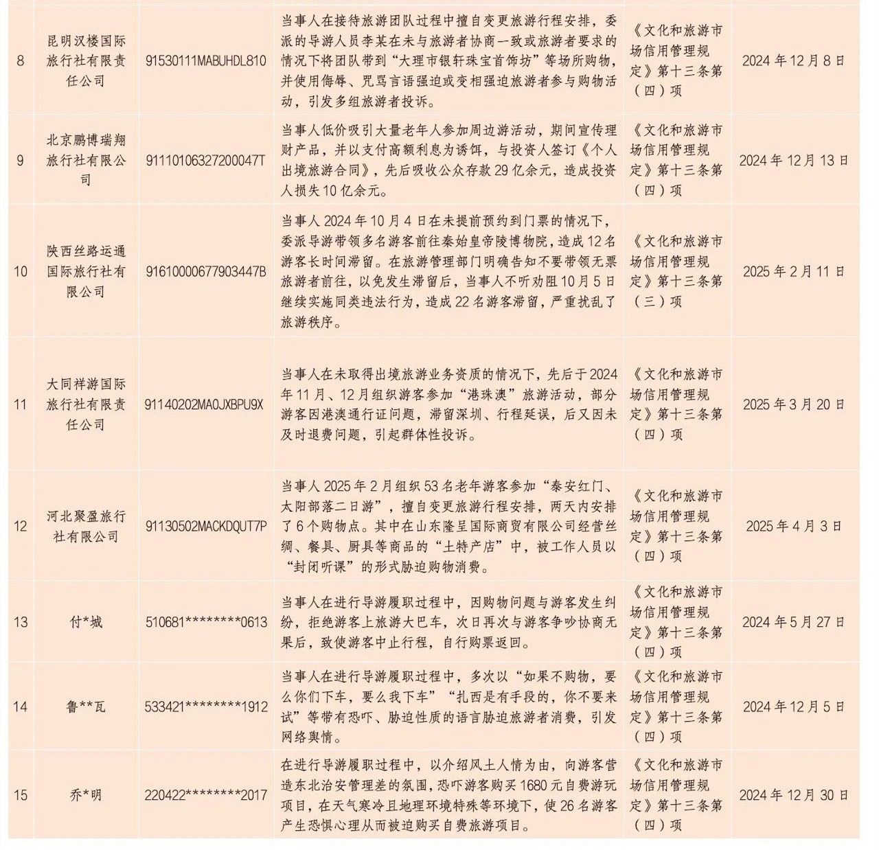 2025年7月9日,文旅部通过官方渠道公布旅游市场严重失信主体典型失信行为(第一批),涉及13家旅行社及2名导游,其失信行为包括擅自变更行程、强迫购物、不合理低价游等,均依据《文化和旅游市场信用管理规定》第十三条相关条款被认定为严重失信主体。