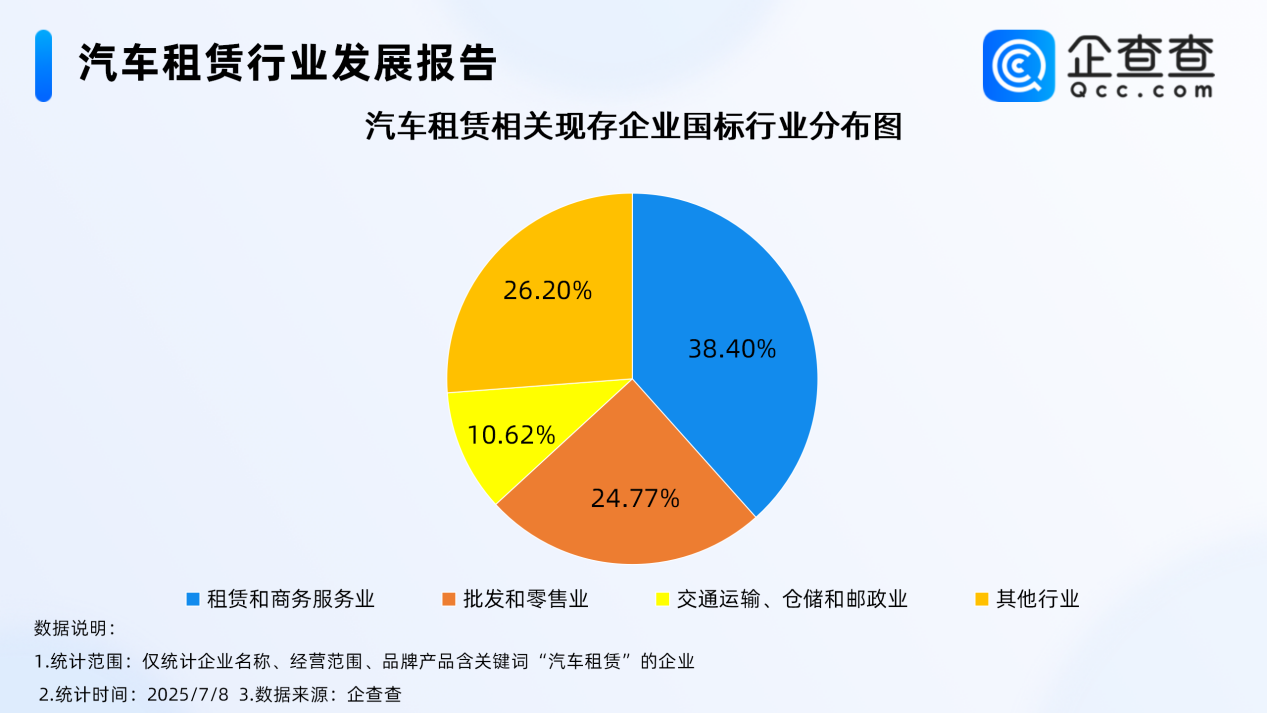 企查查数据显示,截至7月8日,国内汽车租赁相关现存企业达91.09万家,其中,近4成相关企业归属于租赁和商务服务业,占比达38.4%,此外归属于批发和零售业,交通运输、仓储和邮政业相关企业,分别占比24.77%、10.62%。