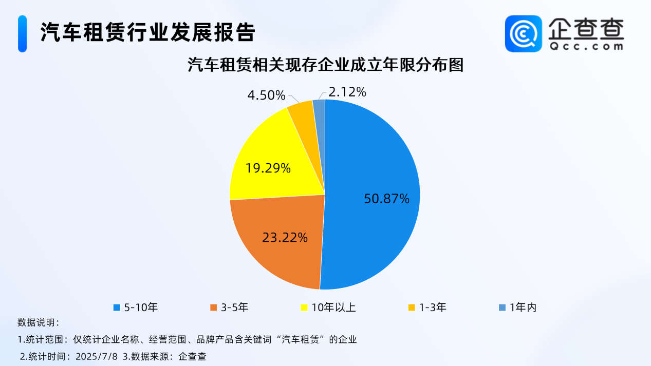 企查查数据显示,从成立年限来看,在现存汽车租赁相关企业中,成立年限在5-10年的相关企业最多,占比达50.87%。其次,成立年限在3-5年的相关企业,占比23.22%。