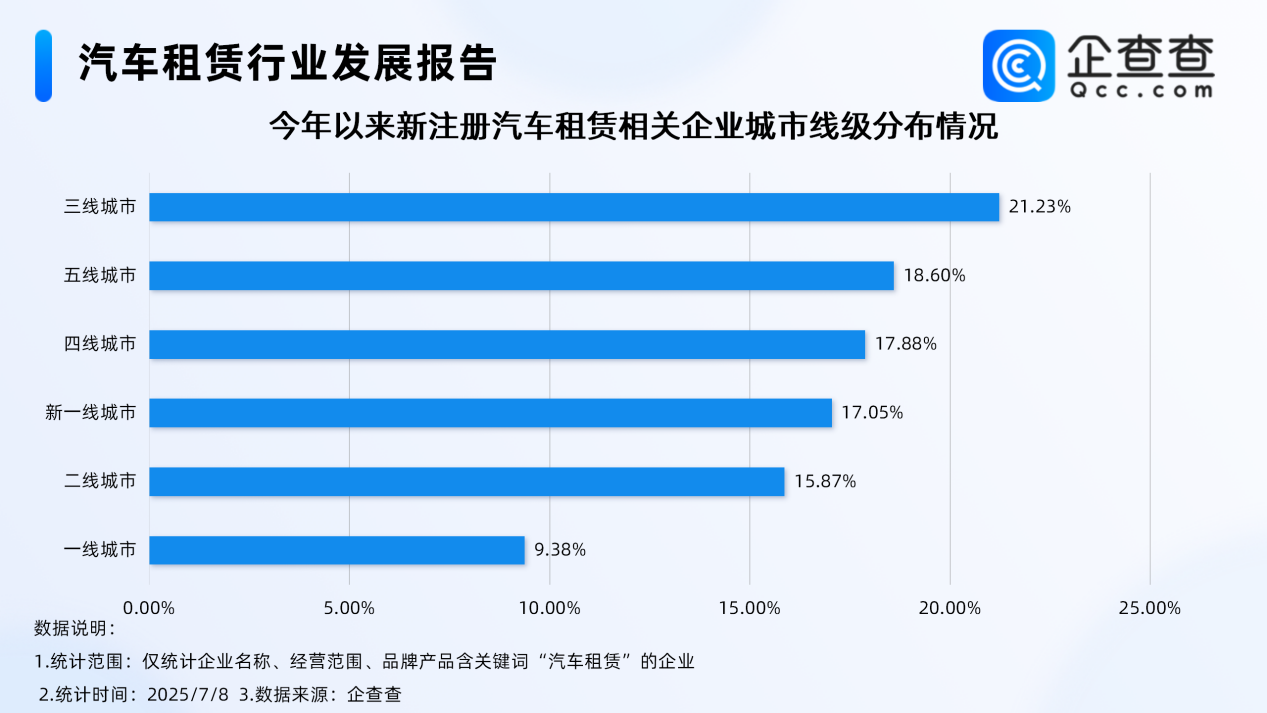 企查查数据显示,从注册量角度来看,2022年-2024年每年注册量维持在2万家-3万家之间,截至目前,今年已注册9435家。从城市线级分布来看,今年新注册企业多集中在三线及以下城市,其中位于三线城市的相关企业占比达21.23%,五线城市的相关企业占比18.6%,四线城市的相关企业占比17.88%。据媒体报道,年轻人不再局限于打卡常规景点,今年暑期“冷门小城探秘”崛起,有报告显示,四线及以下的小城租车量增速预计同比超七成。