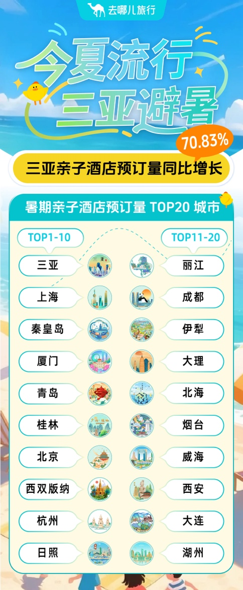 同时,去哪儿的数据显示,今年暑期,三亚酒店整体预订量同比增长46.03%。其中,亲子酒店的预订量同比增长超过70%,领跑大盘。预订三亚酒店的客户中,来自北京、成都、上海、重庆、武汉等一线、新一线的游客最多。这表明,涌入三亚的,不止东北人。