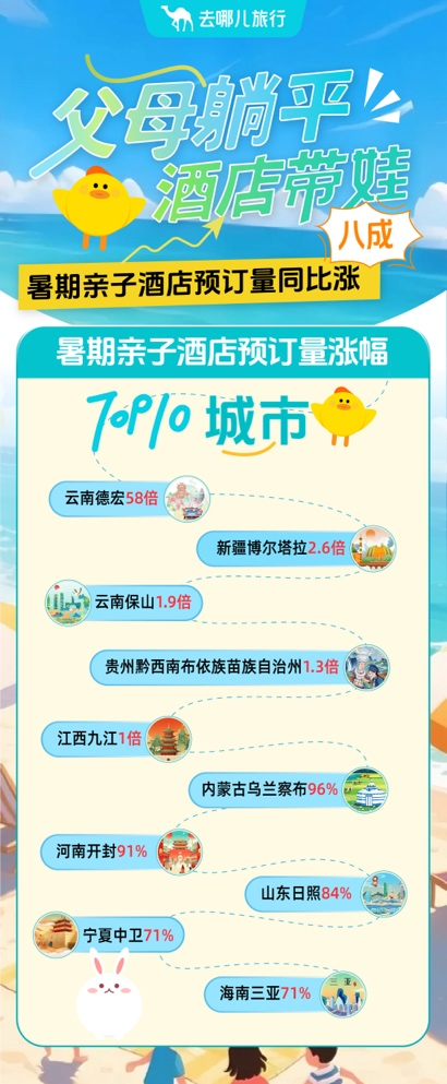 去哪儿平台的数据显示,今年暑期亲子酒店预订量整体涨了八成。预订量涨幅最大的城市有云南德宏、贵州黔西南布依族苗族自治州、江西九江、内蒙古乌兰察布、河南开封、山东日照、宁夏中卫等。