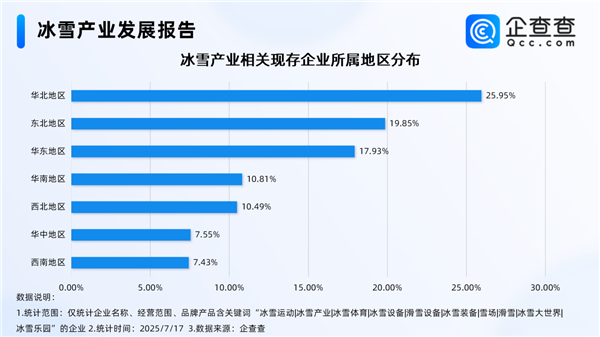 企查查数据显示,截至7月18日,国内冰雪产业相关企业现存量达1.40万家,主要分布在华北地区和东北地区,分别占比25.95%、19.85%。华东地区、华南地区、西北地区相关企业占比均在10%-18%之间,分别占比17.93%、10.81%、10.49%。