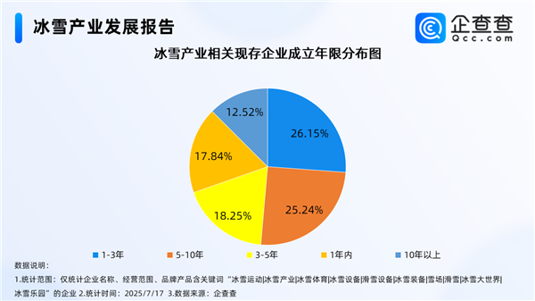 企查查数据显示,从成立年限来看,国内冰雪产业相关现存企业中,成立年限在1-3年的相关企业最多,占比达26.15%。其次为成立年限在5-10年的相关企业,占比达25.24%。