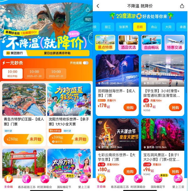市集的烟火、火把节的热烈、古镇的晚风......云南正以气候、文化、烟火气的多重魅力,构筑起全国游客,尤其是年轻人心中的 “避暑天花板”。为促进暑期文旅消费,美团旅行近日上线“不降温,就降价:暑期好去处,1元就能go!”主题活动,为美团用户提供专属“高温补贴”,即日起到8月31日,每天都有热门景点门票1元限时限量秒杀。