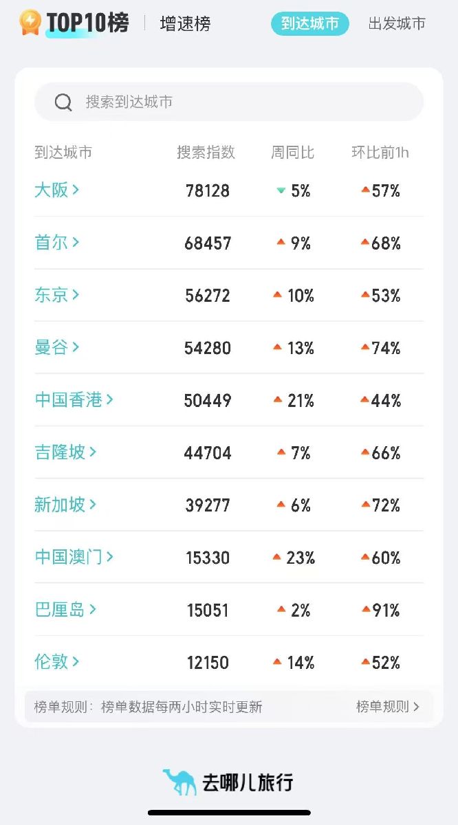 据央视新闻消息,韩国政府将从9月29日起针对中国团队游客实行临时免签政策。去哪儿指数数据显示,消息发布后的半小时内,去哪儿平台上以韩国首尔为目的地的搜索量瞬时增长七成,最高达到1.2倍。其中,上海到首尔的机票搜索量最高,平均含税价格519元。