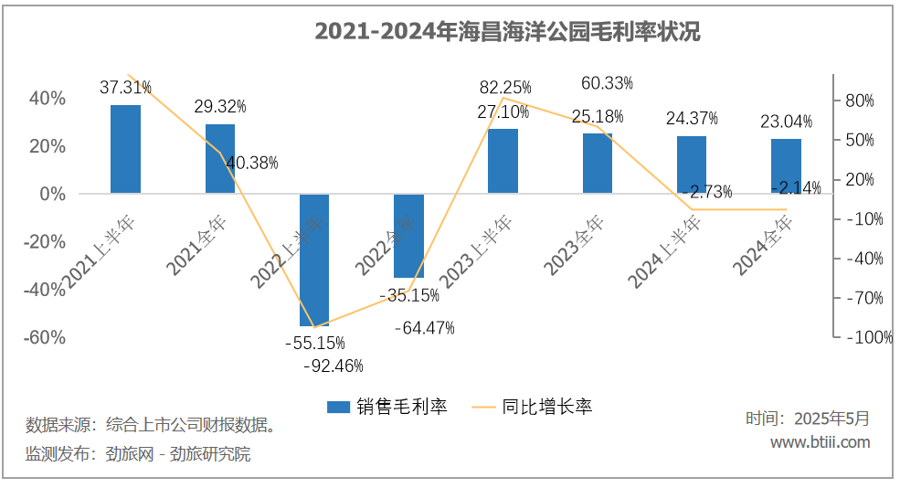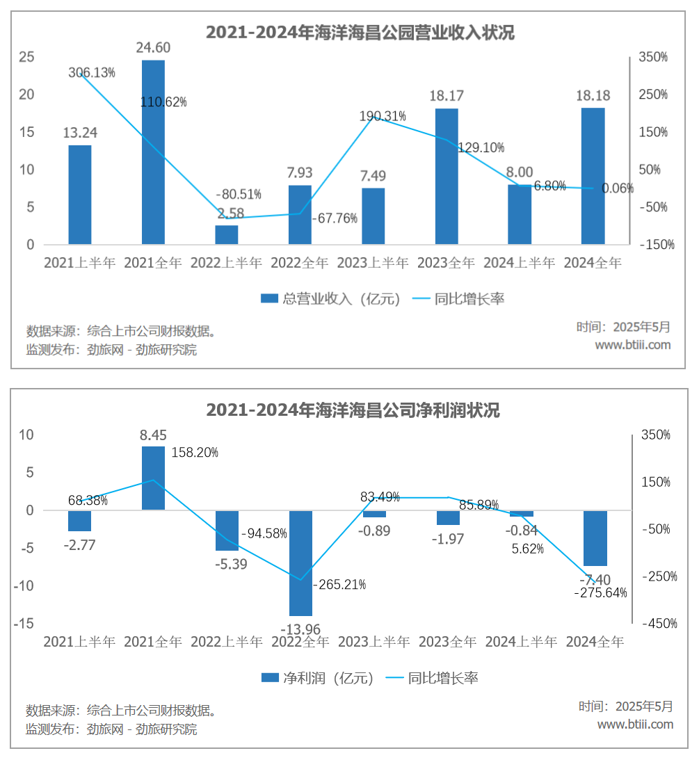 根据报告,2024年海昌海洋公园营业收入18.18亿元,上年同期为18.17亿元,同比增长0.06%。净利润亏损7.4亿元,上年同期为亏损1.97亿元,同比增亏275.64%。