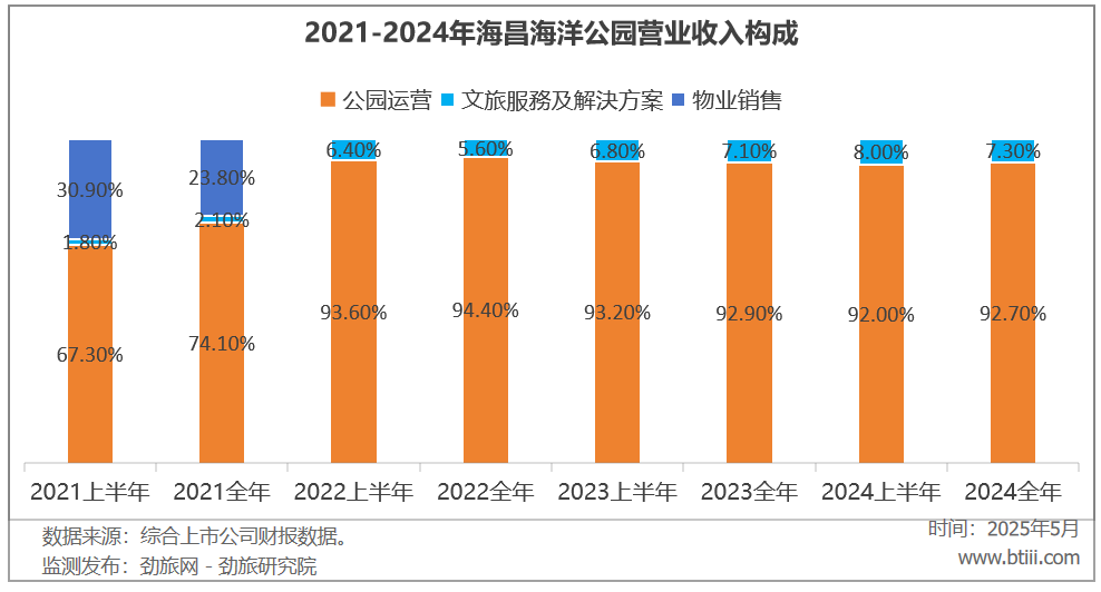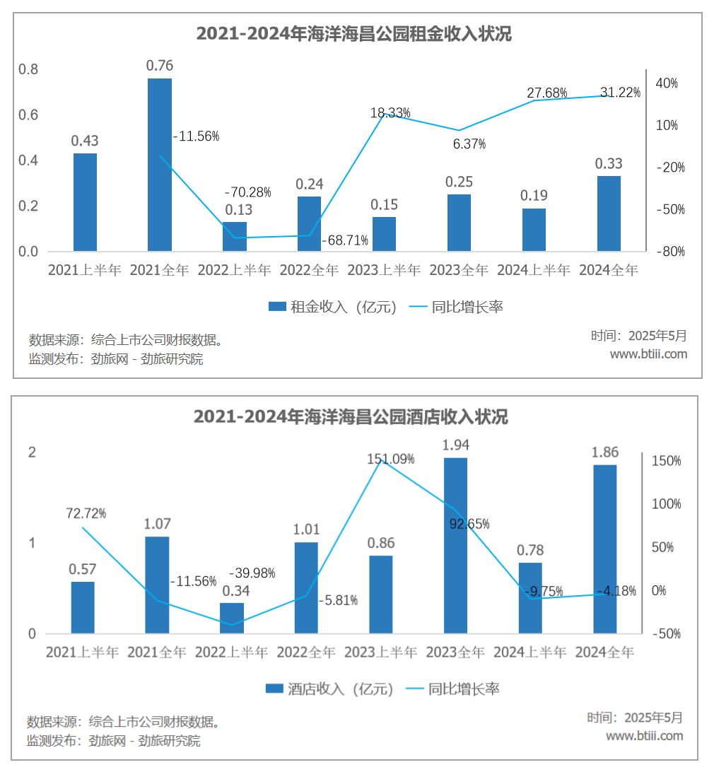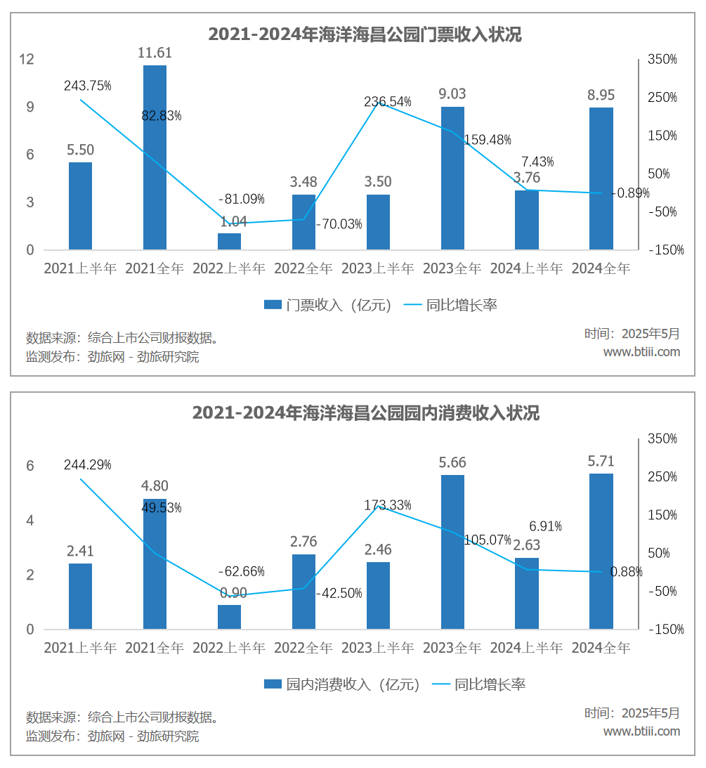 公园运营业务中,门票收入为8.95亿元,上年同期为9.03亿元,同比下降0.89%。园内消费5.71亿元,上年同期为5.66亿元,同比增长0.88%。租金收入为0.33亿元,上年同期为0.25亿元,同比增长31.22%。酒店收入为1.86亿元,上年同期为1.94亿元,同比下降4.18%。