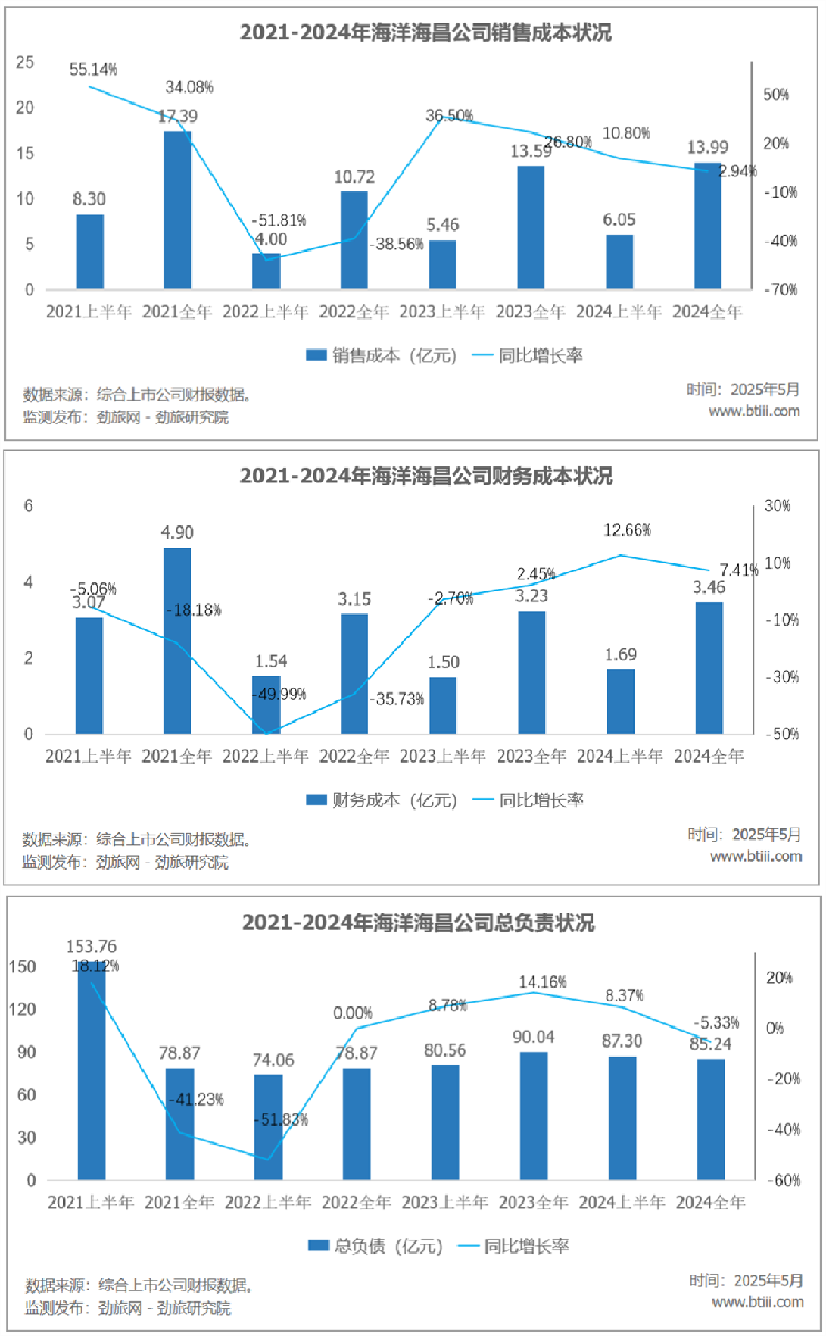 2024年,海昌海洋公园销售成本为13.99亿元,上年同期为13.59亿元,同比增长2.94%。财务成本为3.46亿元,上年同期为3.23亿元,同比增长7.41%。总负债为85.24亿元,上年同期为90.04亿元,同比下降5.33%。