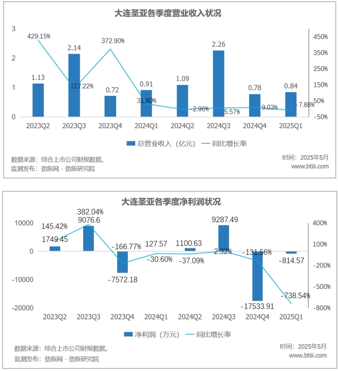 根据报告,大连圣亚一季度实现营业收入0.84亿元,上年同期为0.91亿元,同比下降7.88%。归属于上市公司股东的净利润亏损814.57万元,上年同期为127.57万元,同比下降738.54%。