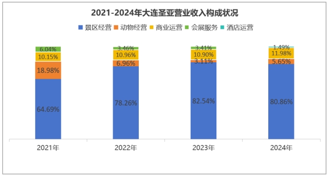 2024年大连圣亚主营业务中,景区经营、动物经营、商业运营、酒店运营营业收入占比分别为80.86%、5.65%、11.98%、1.49%。