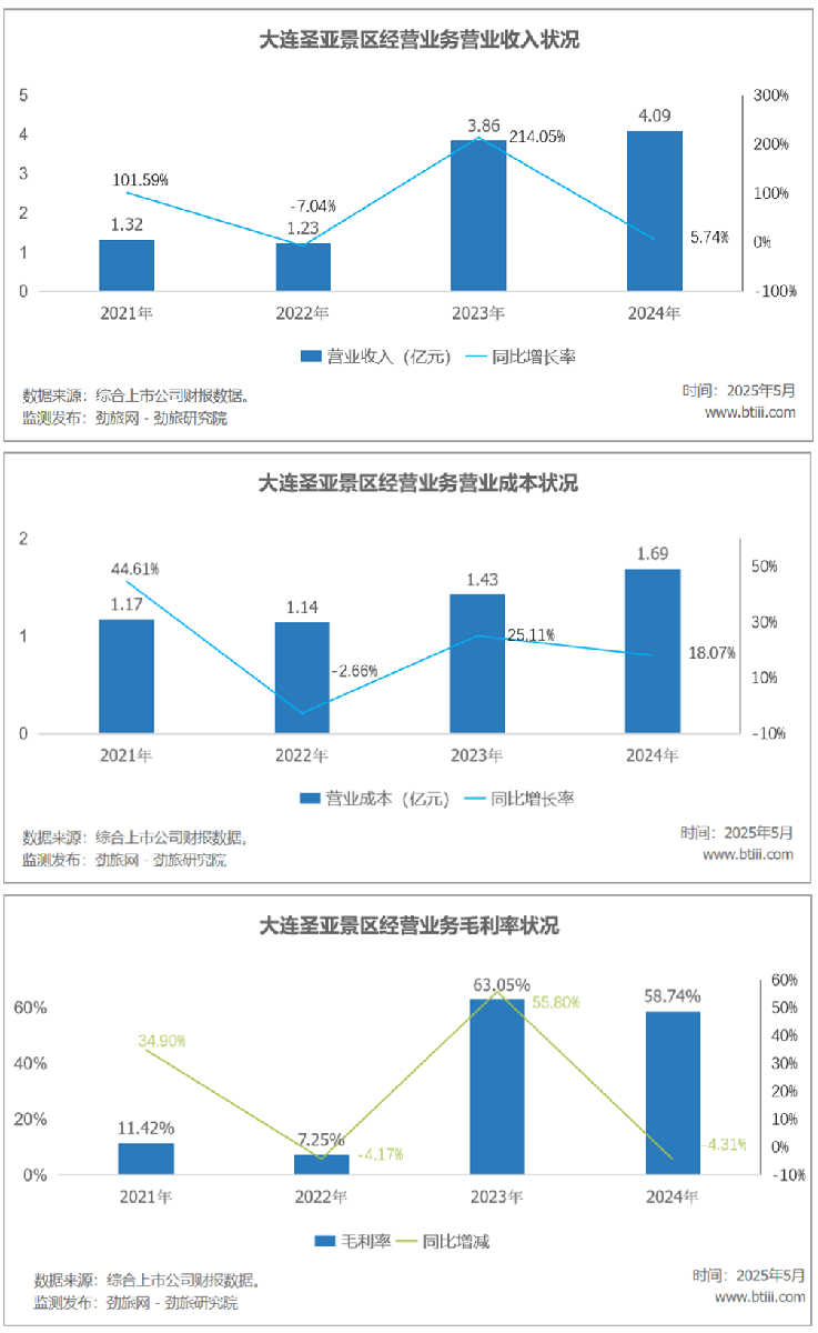 景区经营实现营业收入4.09亿元,上年同期为3.86亿元,同比增长5.74%。营业成本为1.69亿元,上年同期为1.43亿元,同比增长18.07%。毛利率58.74%,同比下降4.31%。