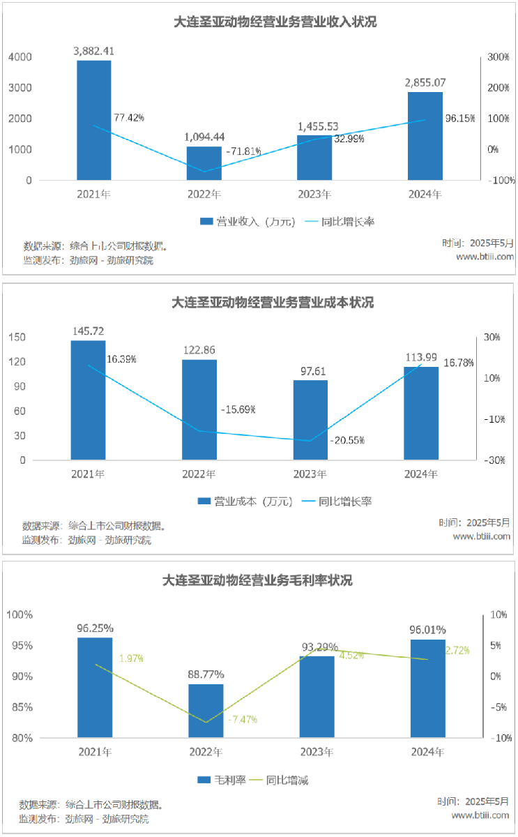动物经营营业收入2855.07万元,上年同期为1455.53万元,同比增长96.15%。营业成本为113.99万元,上年同期为97.61万元,同比增长16.78%。毛利率96.01%,同比增长2.72%。