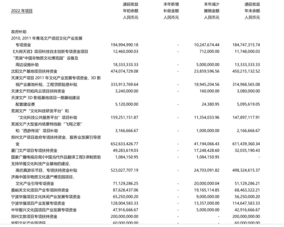 主业盈利承压。据2024年财报,主题公园业务贡献了华强方特约80%的营收,达56.53亿元。其中运营收入46.14亿元,同比下降4.18%;运营成本却同比增长9.17%,这一降一升导致运营毛利率大幅下滑了21%。此外,公司还过分依赖地方政府补助。招股书显示,2016—2018年,华强方特收到的政府补助金额分别为3.53亿元、3.30亿元和3.27亿元,均占当年利润总额的35%以上。直到2022年,政府补助依然是重要利润来源,约3.69亿元,以文化产业发展专项资金以及项目补助、扶持资金为主。