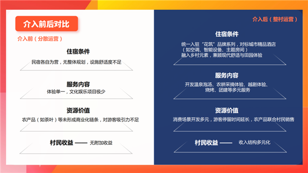 3.从运营模式上,依托旅悦科技赋能与全链运营支持,打破传统乡村文旅单打独斗的分散格局,实现整村运营体系化的开发。