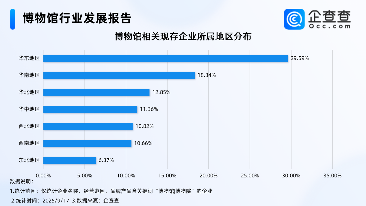 企查查数据显示,截至9月中旬,国内博物馆相关现存企业达1.16万家,主要分布在华东地区,占比达29.59%。其次为分布在华南地区的相关企业,占比达18.34%。分布在华北地区、华中地区、西北地区、西南地区的相关企业,占比均在10%-13%之间。