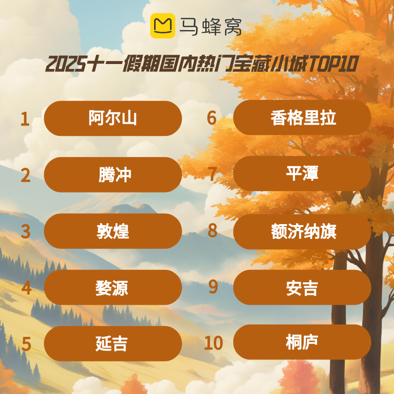 传统热门城市预计将在国庆假期迎来客流高峰,北京、上海、成都、西安、杭州、重庆、广州、杭州、南京、青岛位列十一国内热门城市前十。拒绝“人山人海”的年轻旅行者则把目光投向更多县一级的宝藏小城,收获兼具舒适度和性价比的体验。阿尔山、腾冲、敦煌、婺源、延吉、香格里拉、平潭、额济纳旗、安吉、桐庐跻身国内热门小城榜单前列,率先迎来秋色的阿尔山以340%的热度涨幅成为“反向出行”首选。