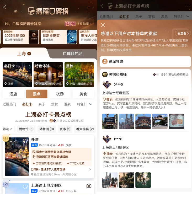 记者打开携程口碑榜上海必打卡景点榜单发现,该榜单标示已经过共207位验榜师认证,榜单上不乏上海迪士尼度假区这类热门景点,黑钻验榜师提示入园带好身份证或电子版,并留下“活人感”十足的贴士:“3点去拍城堡人少又好出片,注意非万圣节期间不能cos迪士尼角色。”