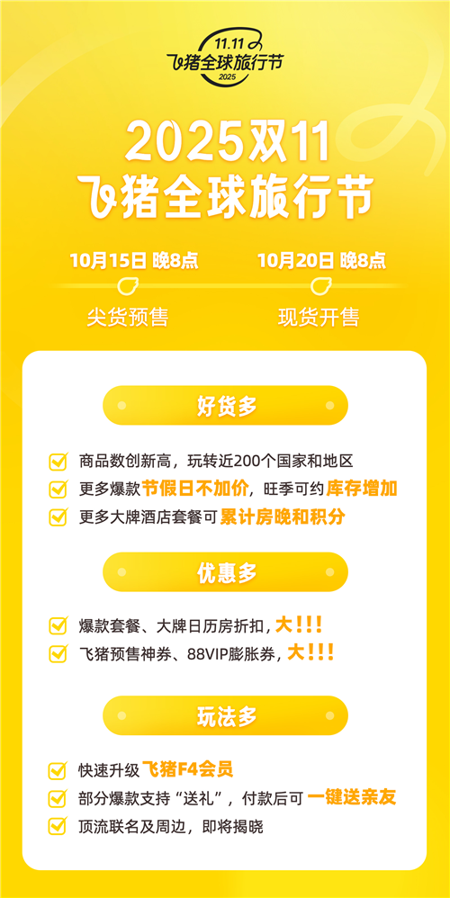 10月15日,飞猪宣布2025年双11全球旅行节启动,其中尖货预售于当日晚8点开始,全量现货将于20日晚8点开始。