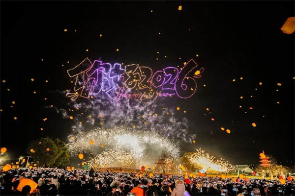▲无人机组成2026巨型光绘图案,与游客一同跨年许愿(图源:禅意小镇拈花湾)