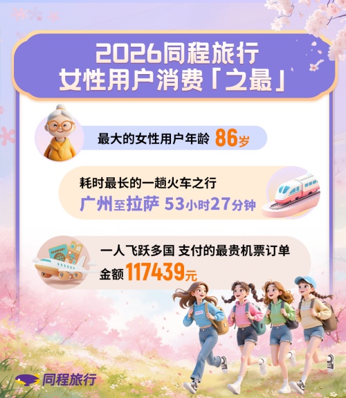 3月6日,同程旅行发布《2026女性旅行消费报告》,透过一组组数字见证近一年来女性用户旅行边界的新突破。这一年里,她们向往自由与远方,年均消费频次较男性用户高出4.6次;不受年龄束缚,60后70后女性用户订单同比增速断层式领先,是名副其实的“勇闯世界”奶奶团;积极拥抱旅行AI新浪潮,提问咨询DeepTrip的女性用户占比达到54.18%;注重出游体验和服务品质,过去一年女性用户人均客单价较男性高出20%以上。