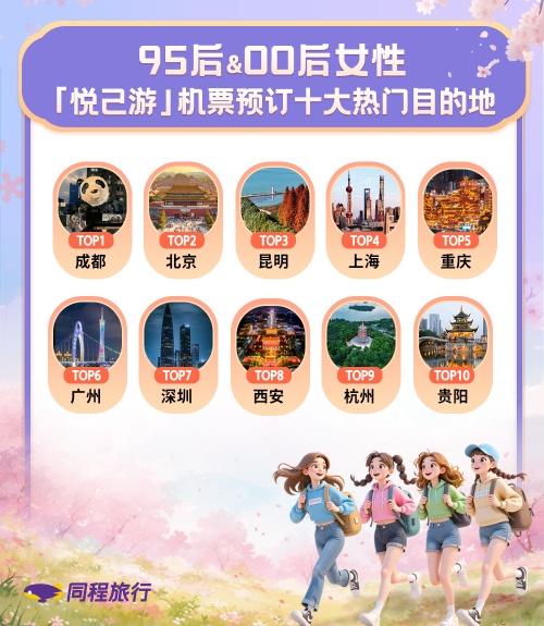 当“爱你老己”式的悦己游成为一种流行趋势,95后和00后女性早已把取悦自己变成一种生活方式。同程旅行平台上,95后和00后女性是“周末微度假”的主力客群,平均每三个星期就会来一场“去班味”之旅。至于出逃到哪里?同程旅行数据显示,从机票预订热度来看,95后和00后女性最爱去的国内城市前10名依次是成都、北京、昆明、上海、重庆、广州、深圳、西安、杭州、贵阳。