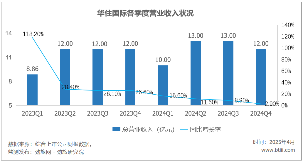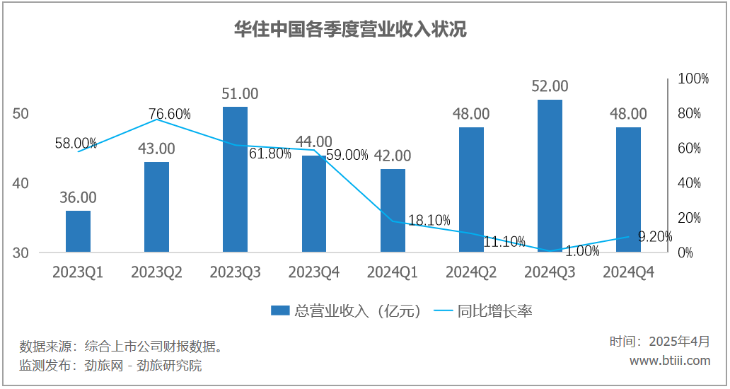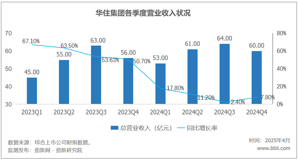 根据报告显示,华住集团四季度营业收入60亿元,上年同期为56亿元,同比增长7.80%。2024年全年营业收入239亿元,同比增长9.2%。