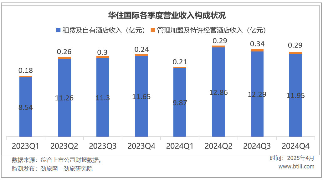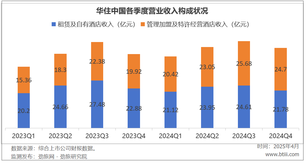 收入构成方面,华住中国租赁及自有酒店收入第四季度和全年收入分别为21.78亿元,91.46亿元;管理加盟及特许经营酒店收入第四季度和全年收入分别为24.7亿元和93.85亿元。
