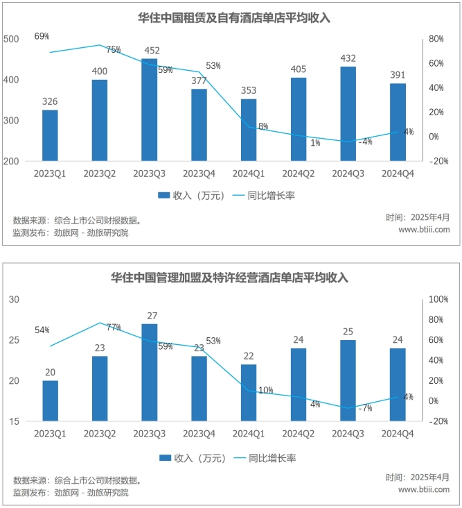 华住中国租赁及自有酒店单店平均收入391万元,同比增长4%。华住中国管理加盟及特许经营酒店单店平均收入24万元,同比增长4%。
