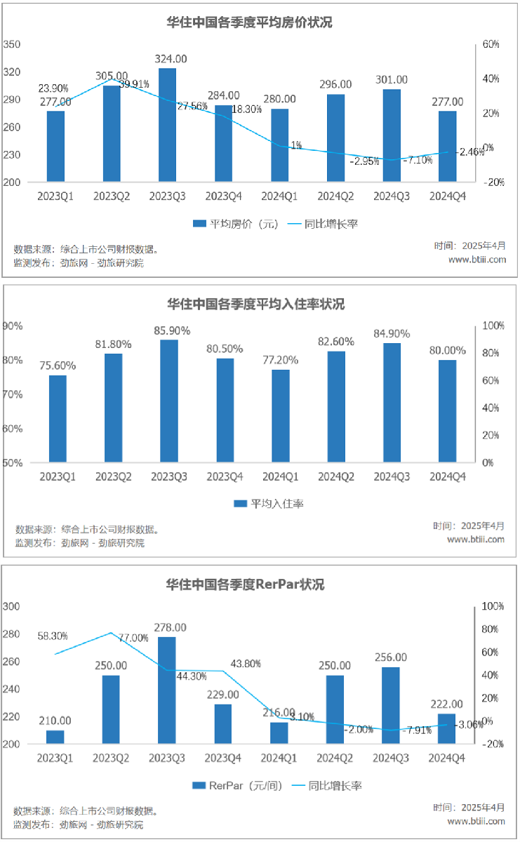 第四季度,华住中国平均房价277元/间,上年同期为284元/间,同比下降2.46%。平均出租率为80%,上年同期为80.5%,同比下降0.5个百分点。平均可出租客房收入222元/间,上年同期为229元/间,同比下降3.06%。