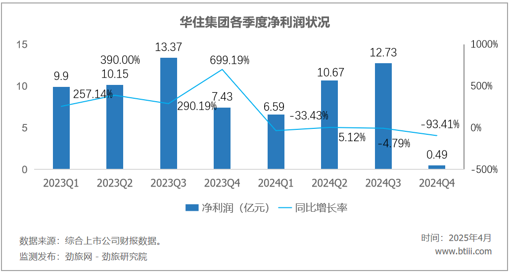 第四季度,华住集团净利润0.49亿元,上年同期为7.43亿元,同比下降93.41%。全年净利润30.48亿元,同比下降25.39%。