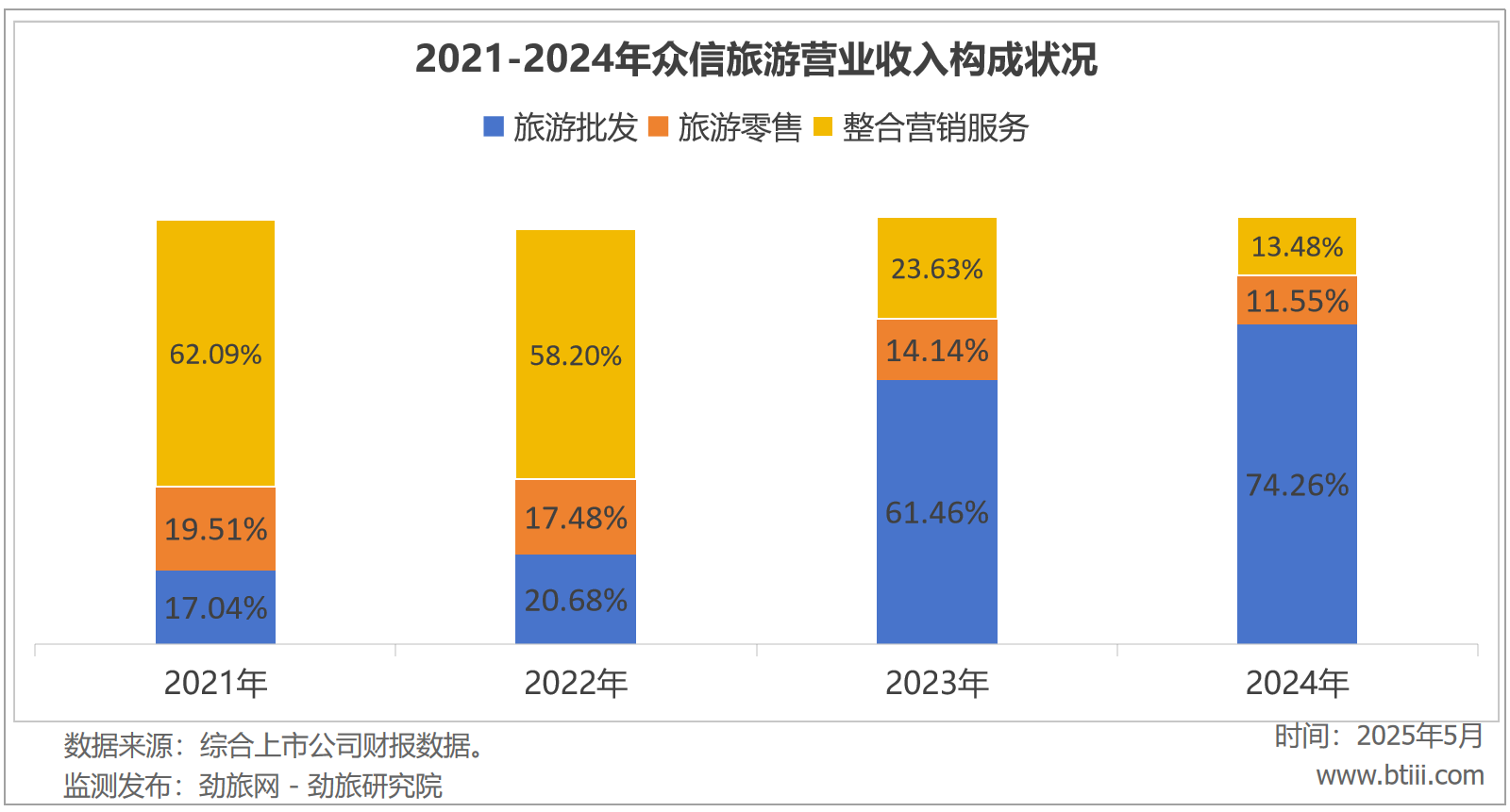 2024年主营业务中,旅游批发、旅游零售、整合营销服务收入占比分别为74.26%、11.55%、13.48%。