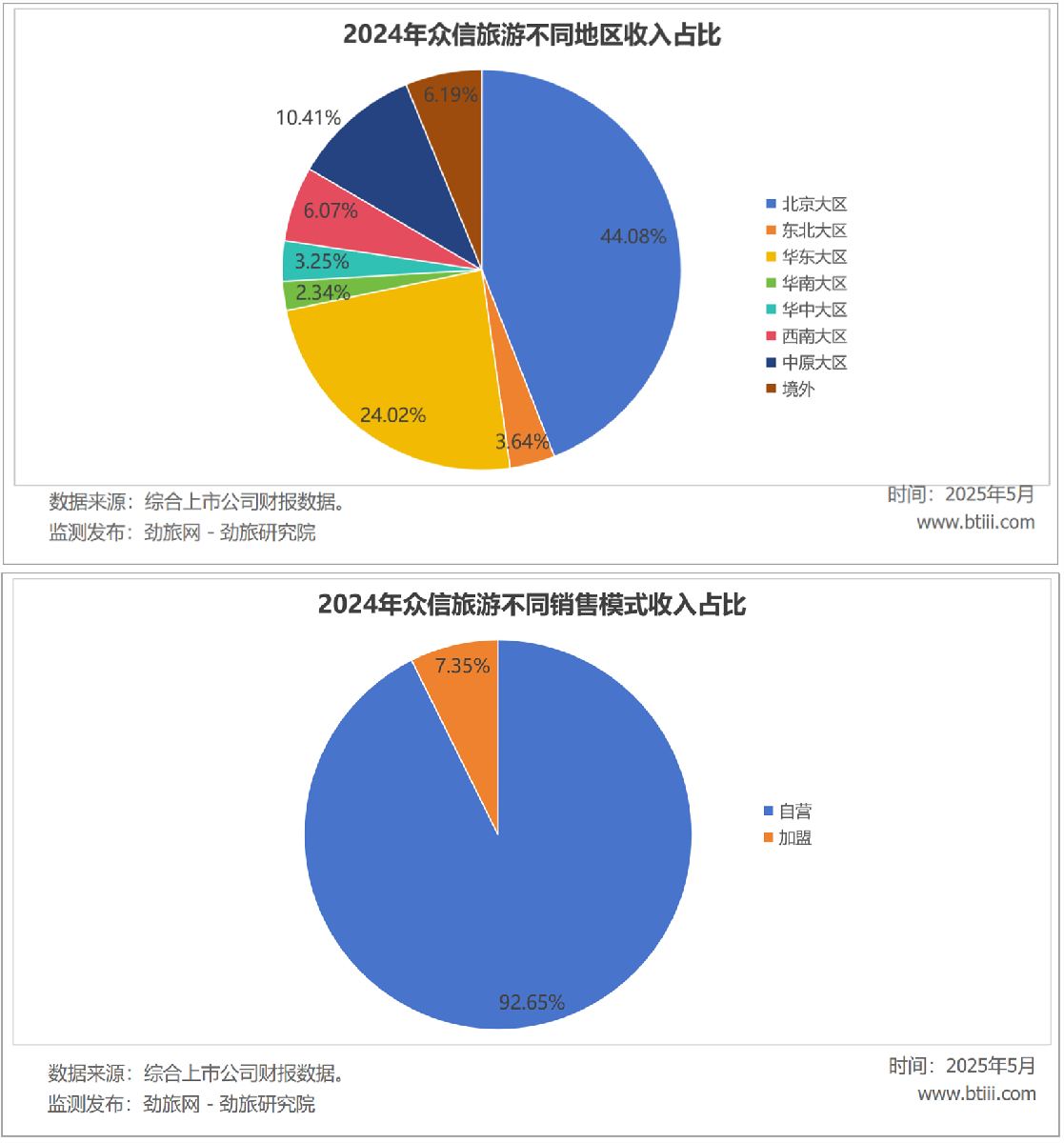 2024年,众信旅游北京大区收入占比为44.08%,东北大区收入占比为3.64%,华东大区收入占比为24.02%,华南大区收入占比为2.34%,华中大区收入占比为3.25%,西南大区收入占比为6.07%,中原大区收入占比为10.41%,境外收入占比为6.19%。此外,自营模式收入占比为92.65%,加盟模式收入占比为7.35%。