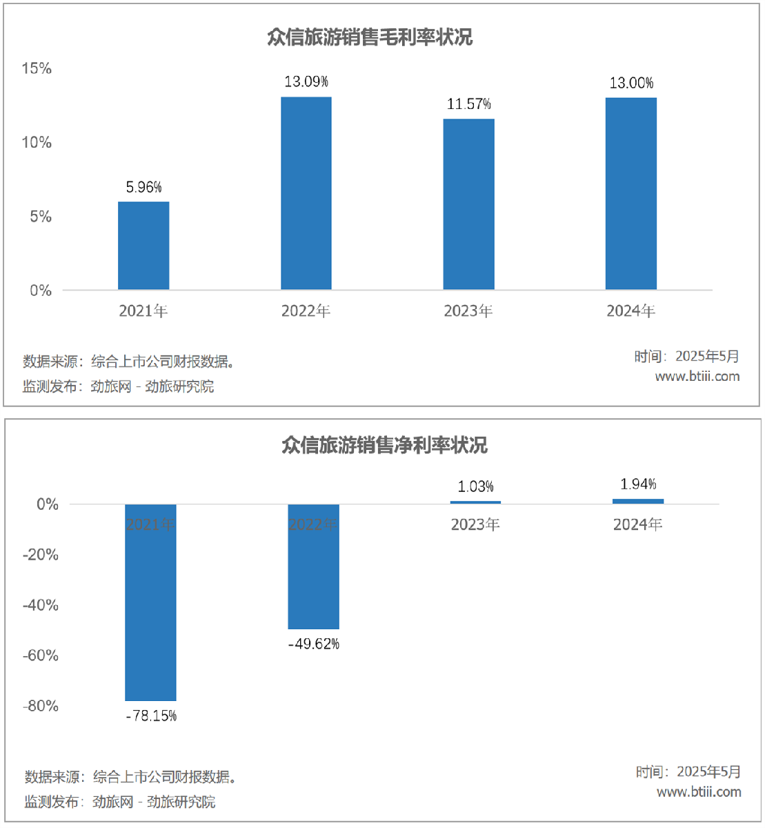 2024年,众信旅游销售毛利率13.0%,上年度为11.57%,同比增长1.43个百分点。销售净利润1.94%,上年度为1.03%,同比增长0.91个百分点。