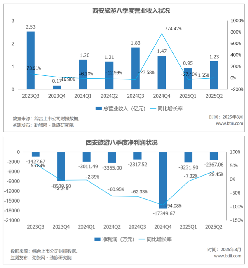 根据报告,西安旅游第二季度实现营业收入1.23亿元,上年同期为1.21亿元,同比增长1.65%。归属于上市公司股东的净利润亏损2367.06万元,上年同期为亏损3355.00万元,同比减亏29.45%。
