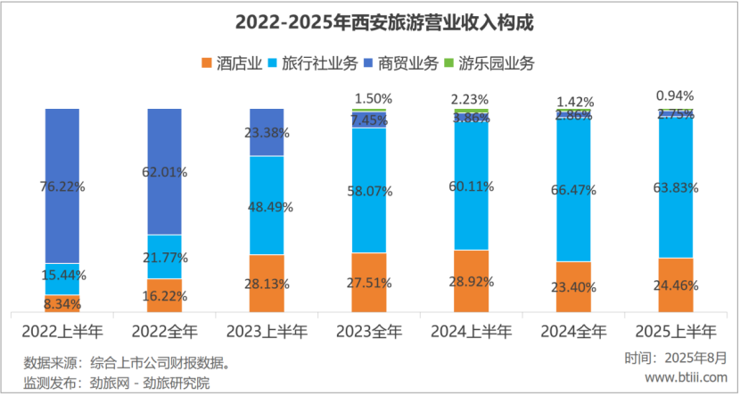 上半年,西安旅游的主营业务中,酒店业、旅行社业务、商贸业务、游乐园业务营业收入占比分别为24.46%、63.83%、2.75%、0.94%。