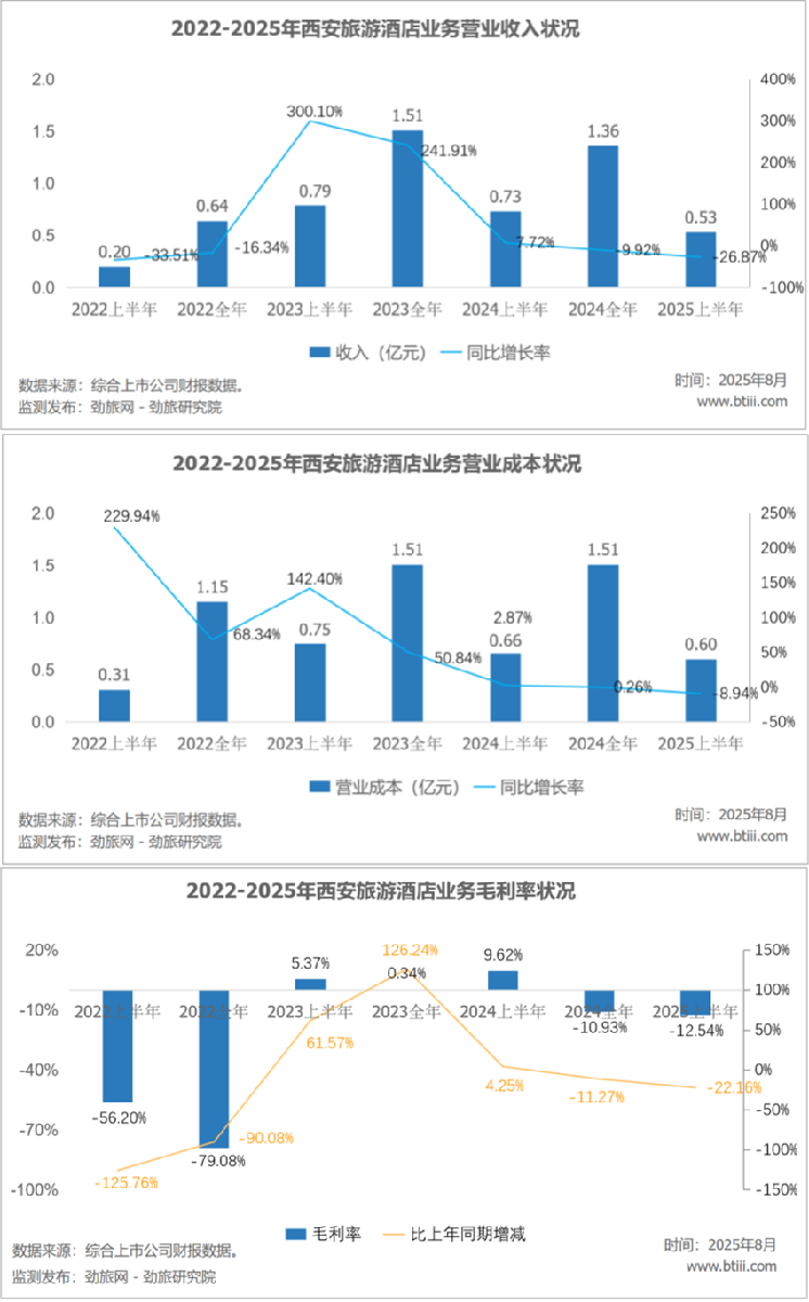 第二季度,酒店业务实现营业收入0.53亿元,上年同期为0.73亿元,同比下降26.87%。营业成本为0.60亿元,上年同期为0.66亿元,同比下降8.94%。毛利率为-12.54%,同比下降22.16个百分点。