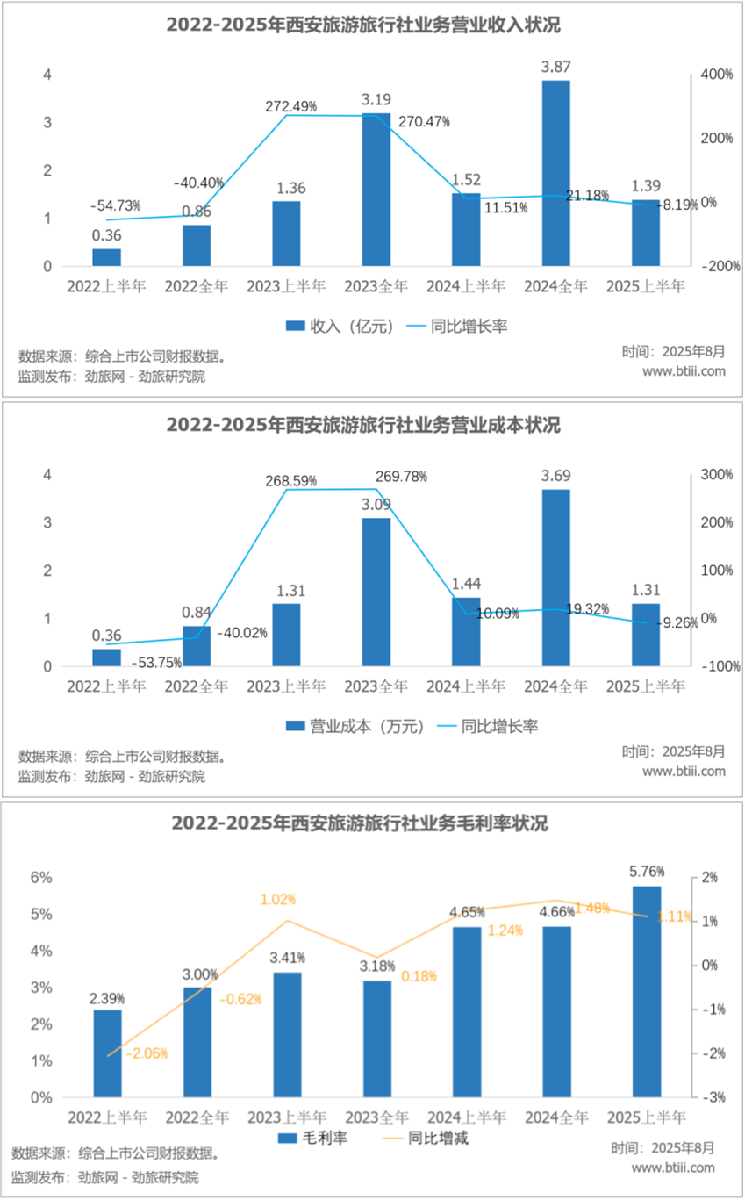 旅行社业务第二季度实现营业收入1.39亿元,上年同期为1.52亿元,同比下降8.19%。营业成本为1.31万元,上年同期为1.44万元,同比下降9.26%。毛利率为5.76%,同比增长1.11个百分点。