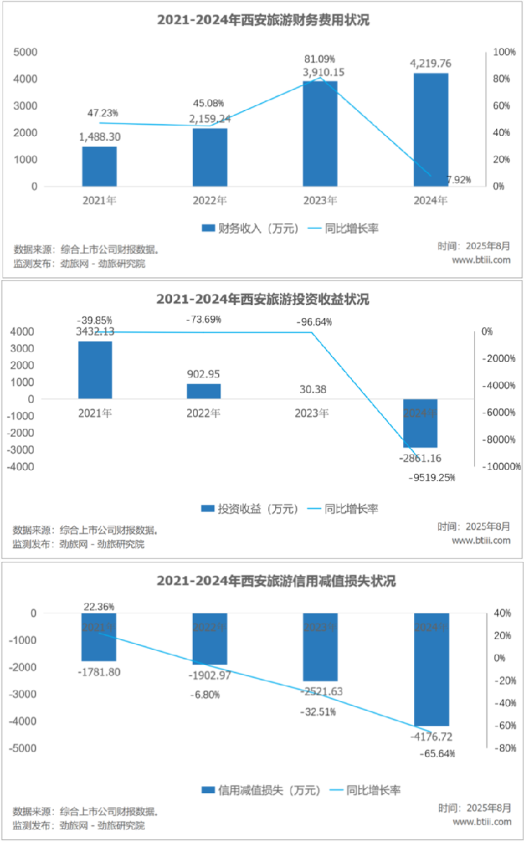 2024年,西安旅游财务费用为4219.76万元,上年同期为3910.15万元,同比增长7.92%。投资收益亏损2861.16万元,上年同期为30.38万元,同比下降9519.25%。信用减值损失-4176.72万元,上年同期为-2521.63万元,同比下降65.64%。