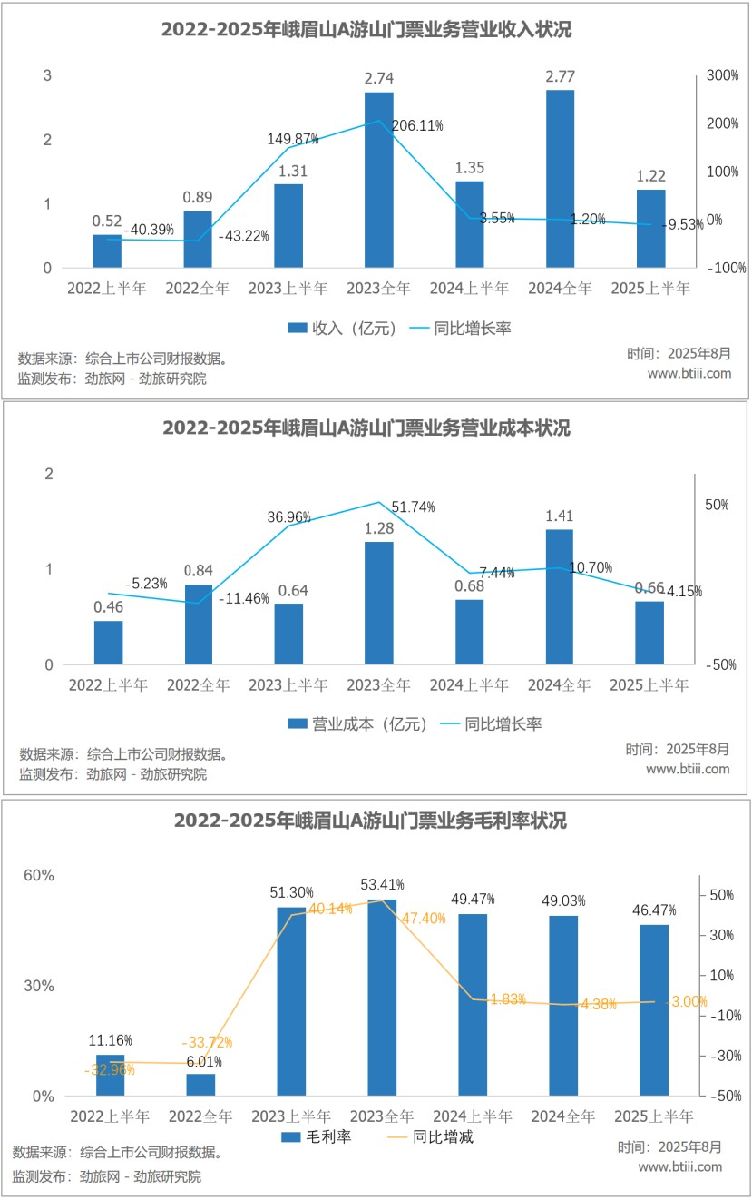 2025上半年,峨眉山A游山门票业务营业收入为1.22亿元,上年同期为1.35亿元,同比下降9.53%。营业成本为0.66亿元,上年同期为0.68亿元,同比下降4.15%。毛利率为46.47%,上年同期为49.47%,同比下降3个百分点。