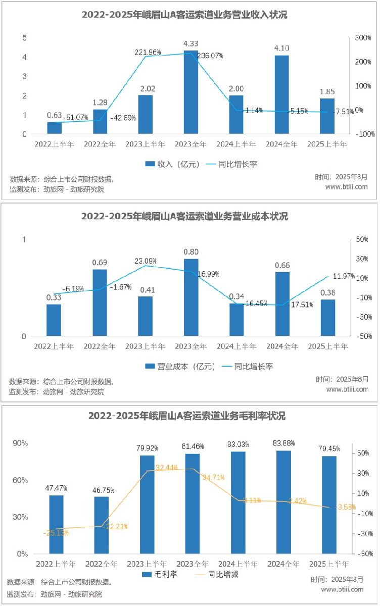 2025上半年,峨眉山A索道业务营业收入1.85亿元,上年同期为2.00亿元,同比下降7.51%。营业成本0.38亿元,上年同期为0.34亿元,同比增长11.97%。毛利率79.45%,上年同期为83.03%,同比下降3.58个百分点。