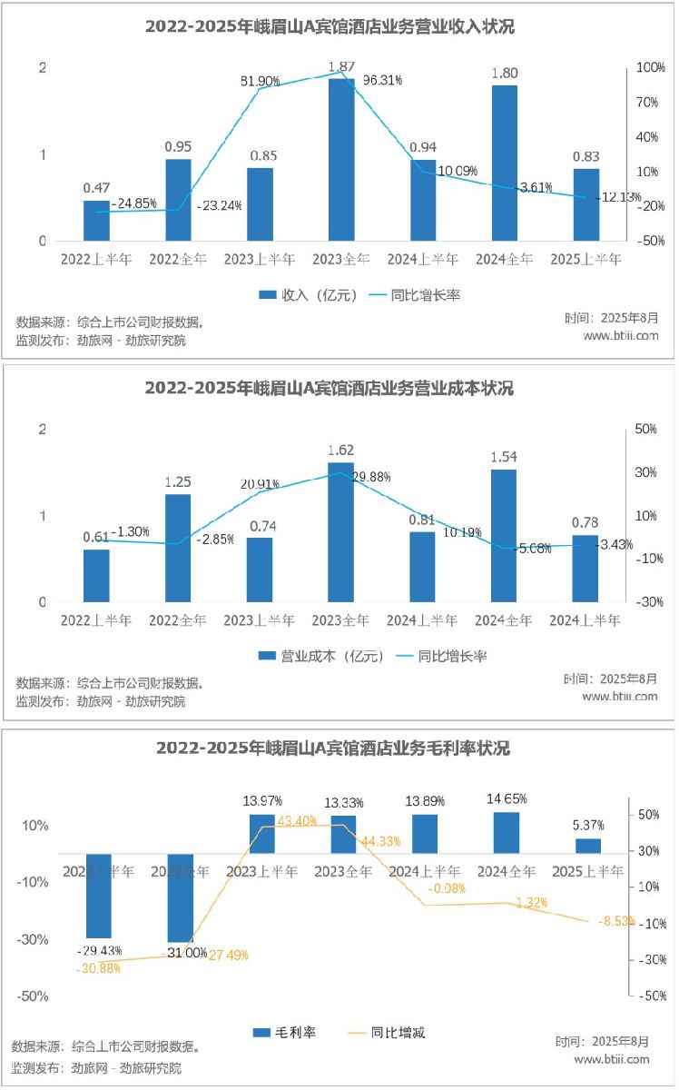 2025上半年,峨眉山A宾馆酒店业务实现营业收入0.83亿元,上年同期为0.94亿元,同比下降12.13%。营业成本为0.78亿元,上年同期为0.81亿元,同比下降3.43%。毛利率5.37%,上年同期为13.89%,同比下降8.53个百分点。