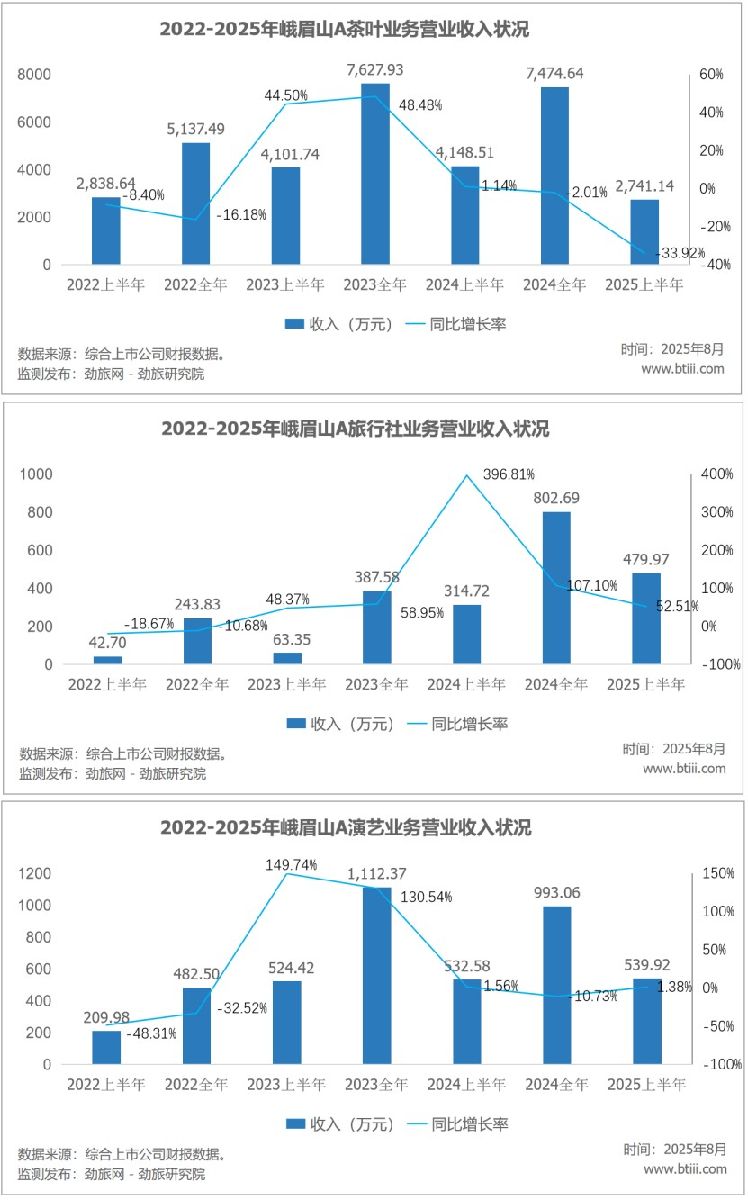 2025上半年,茶叶收入2741.14万元,上年同期为4148.51万元,同比下降33.92%。旅行社业务营业收入479.97万元,上年同期为314.72万元,同比增长52.51%。演艺业务营业收入539.92万元,上年同期为532.58万元,同比增长1.38%。
