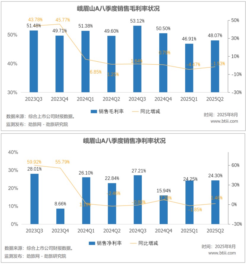2025年二季度,销售毛利率48.07%,上年同期为49.60%,同比下降1.53个百分点。销售净利率24.30%,上年同期为22.84%,同比增长1.46个百分点。