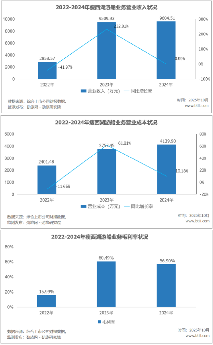 其中,游船业务实现营业收入为9604.51万元,同比增长0.99%。营业成本为4139.90万元,同比增长10.18%。毛利率为56.90%,比上年下降3.59个百分点。