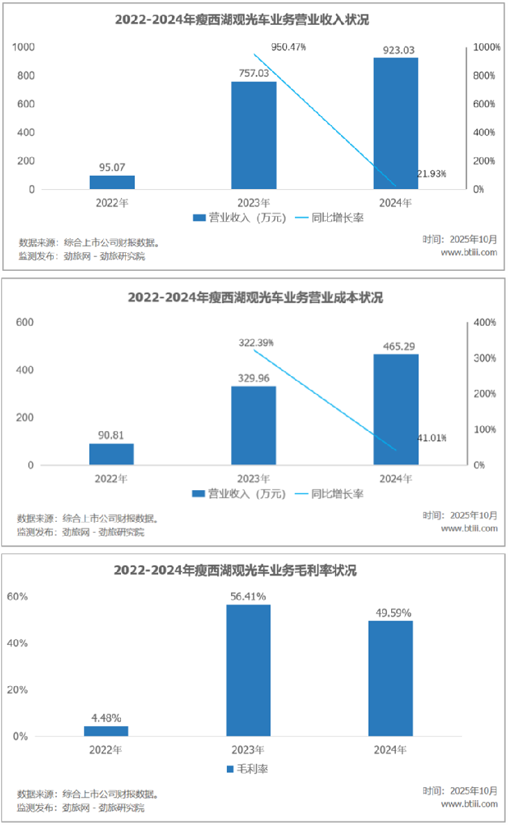 观光车业务实现营业收入923.03万元,同比增长21.93%。营业成本为465.29万元,同比增长41.01%。毛利率49.59%,比上年下降6.82个百分点。